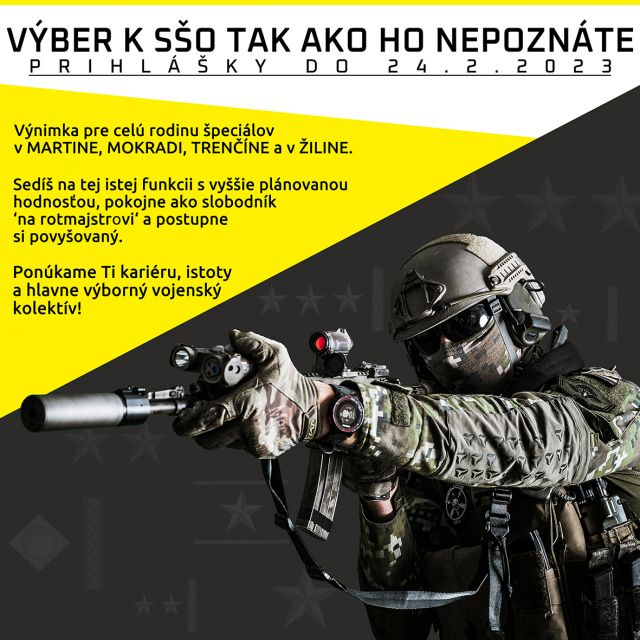 Staň sa aj Ty členom rodiny špeciálov. Ak už si profesionálny vojak a chceš slúžiť v dynamicky sa rozvíjajúcich vojenských spôsobilostiach, veľmi radi Ťa uvidíme vo výbere do útvarov v podriadenosti Síl pre špeciálne operácie a Veliteľstva SŠO. Uvítame nových spolubojovníkov!